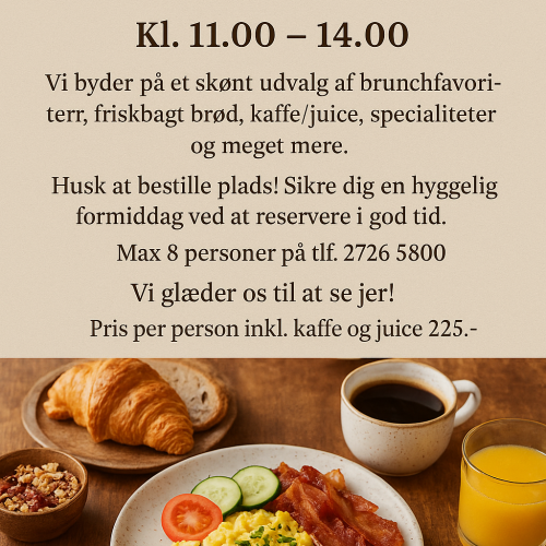 Vi byder på et skønt udvalg af brunchfavoritter, friskbagt brød, kaffe/juice, specialiteter og meget mere.